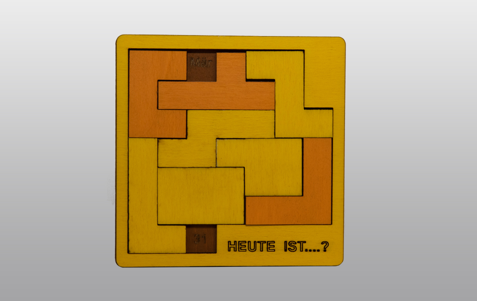 Der Puzzle-Kalender besteht aus eingefärbtem Sperrholz und überzeugt durch seine natürliche, warme Anmutung. Die präzise gelaserten Puzzleteile fügen sich zu einem dauerhaft nutzbaren, wiederverstellbaren Monatskalender zusammen. Das robuste Material sorgt für Langlebigkeit und eine hochwertige Haptik. Durch sein minimalistisches Design eignet sich der Kalender sowohl als funktionales Büroaccessoire als auch als dekoratives Geschenk.